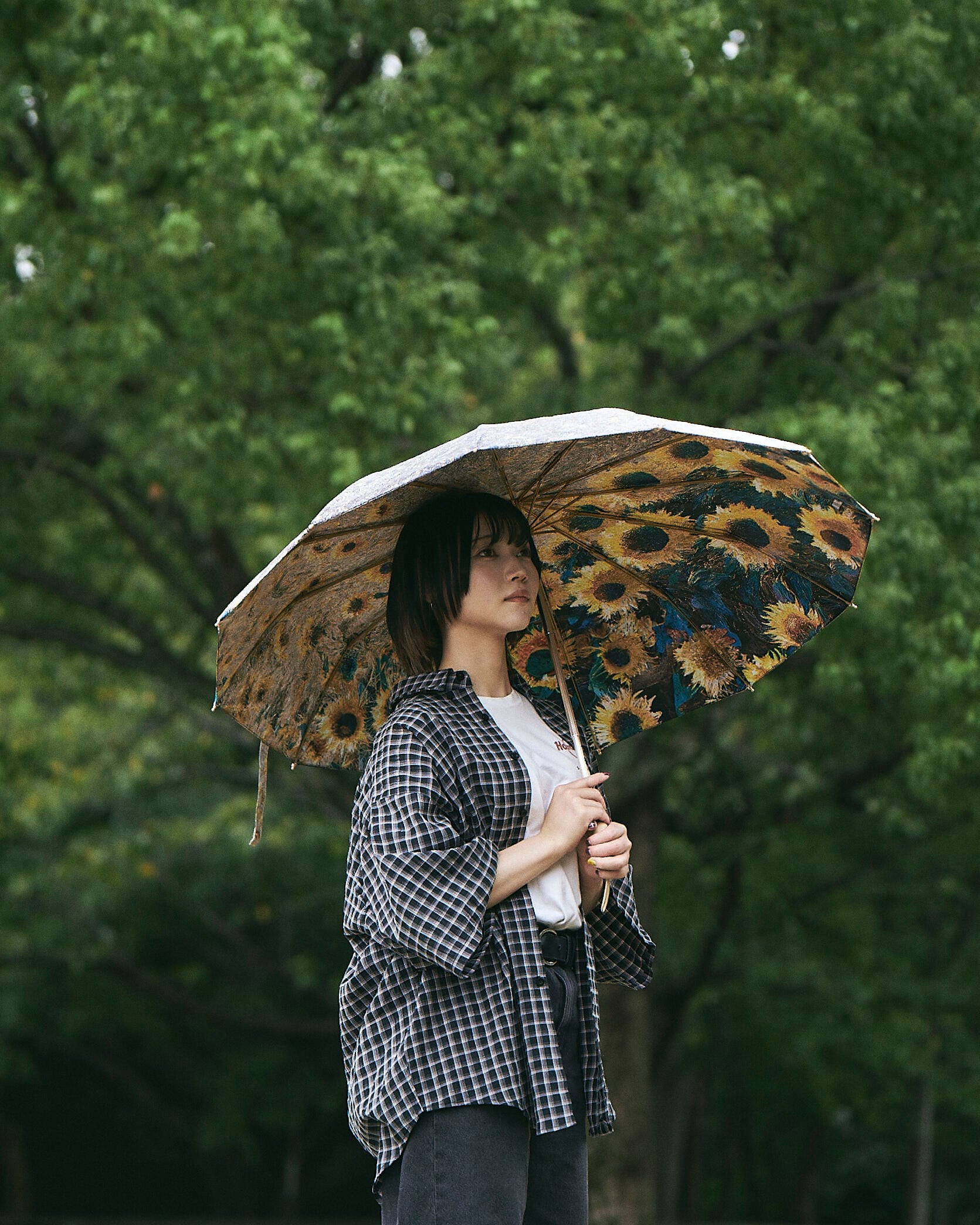 ○金色に輝くひまわりが特徴の三つ折り傘です。