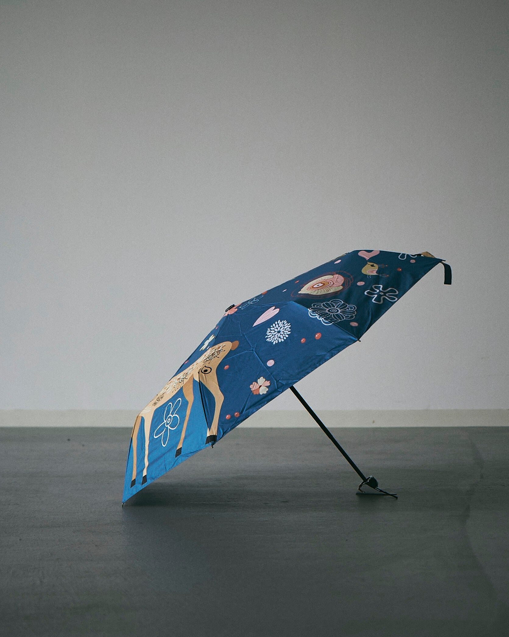 ○青い空に、花を纏った一頭の鹿。まるで夢の中を旅するような、幻想的なデザインの傘です。